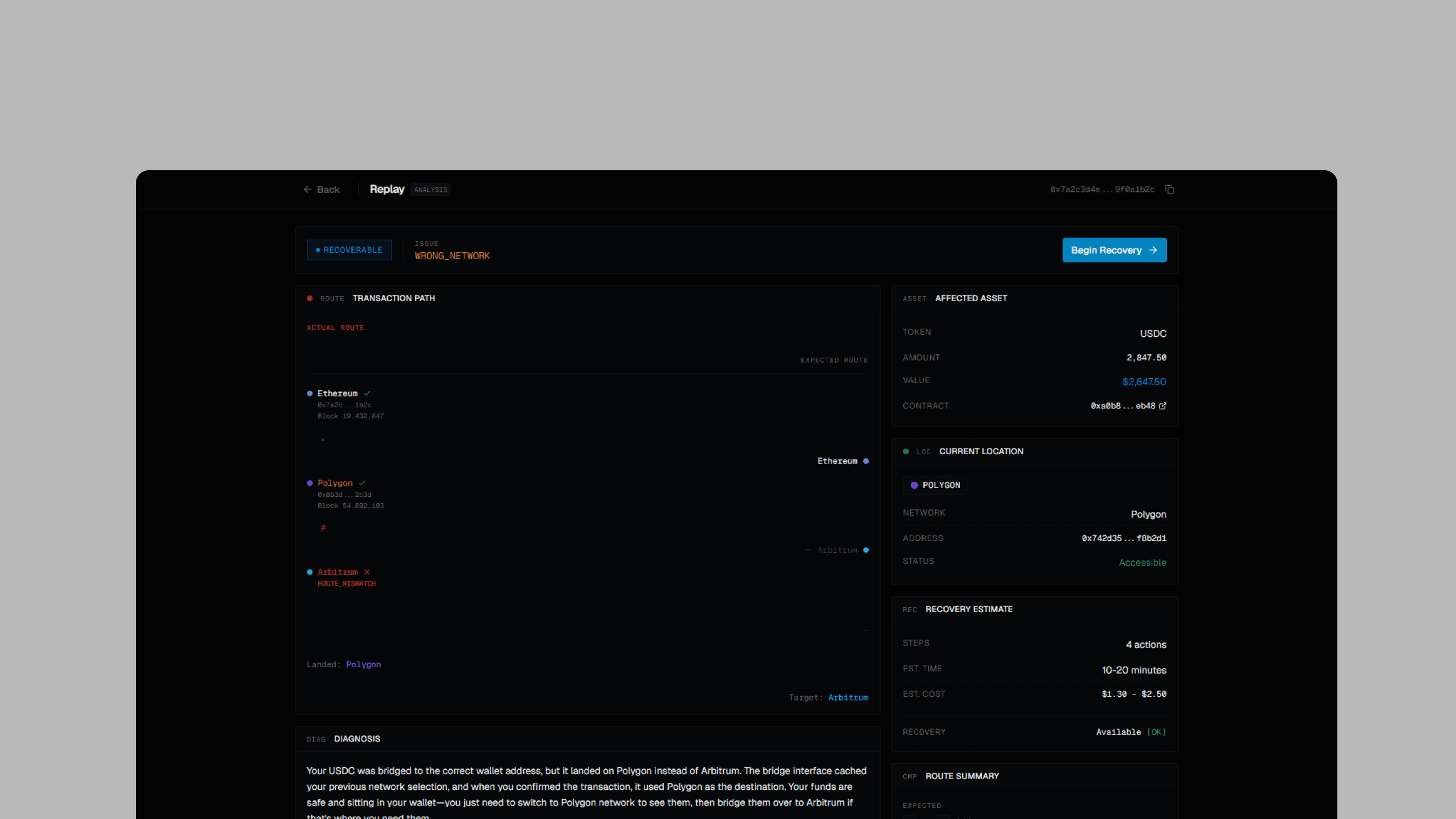 A crypto recovery prototype focused on stuck, failed, or misrouted transfers after the mistake has already happened.
